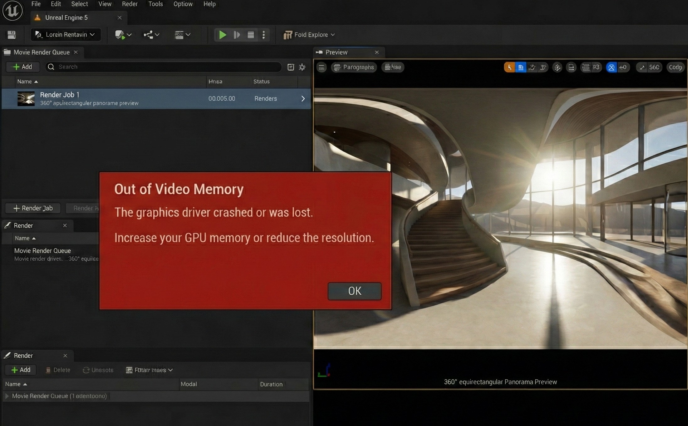 A practical guide to fixing Unreal Engine 360° panoramic “out of video memory” crashes and stabilizing high-resolution VR and ArchViz renders.